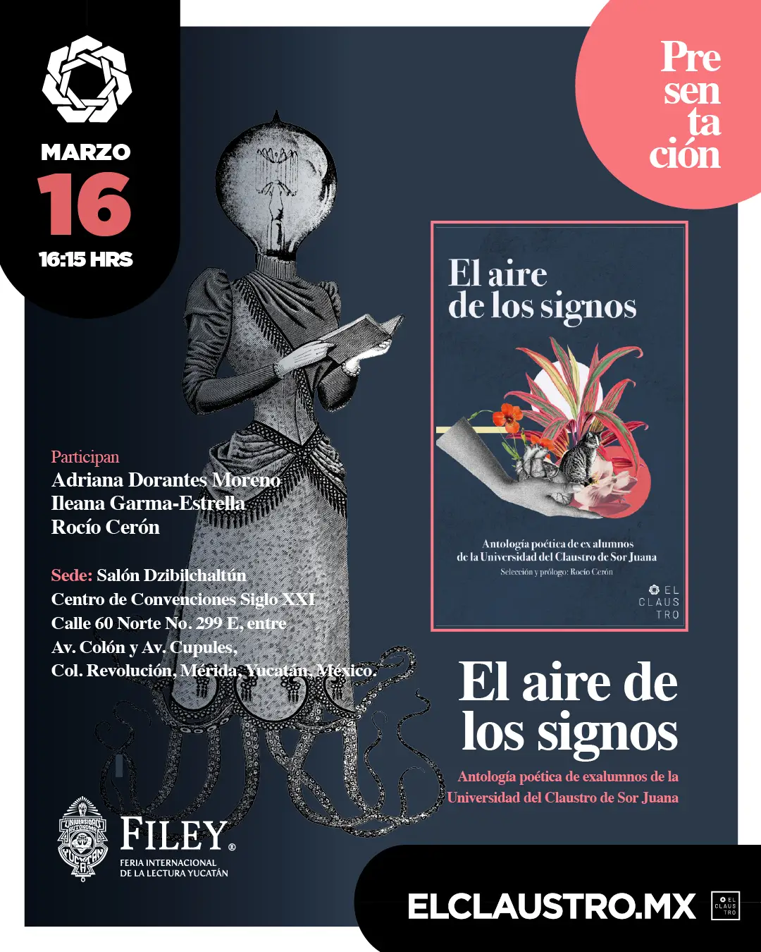 La Universidad del Claustro de Sor Juana presentará en la Feria Internacional de la Lectura Yucatán (FILEY) el libro “El aire de los signos”, una antología poética que reúne la obra de egresadas y egresados de nuestra comunidad universitaria, con selección y prólogo de la poeta Rocío Cerón.